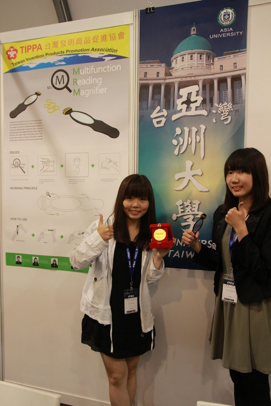 圖說:商設系大三張馨予和視傳系大二姚驊真的發明作品「關懷弱勢多功能閱讀放大鏡」,獲得金牌、波蘭特別獎。